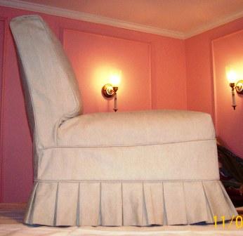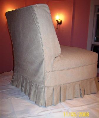 three shots that follow show the same chair in its new linen slipcover with box pleats.