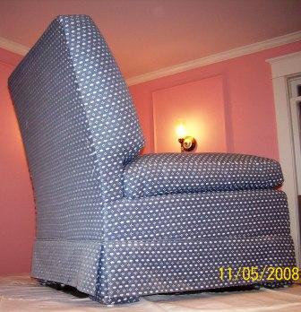 The four shots below are all of the same chair. The blue and white fabric is the "before" -- how the client brought the chair in. The