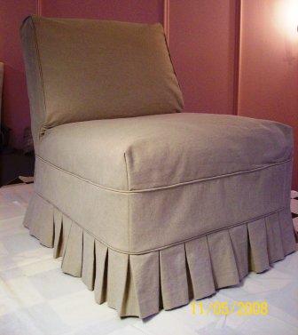 three shots that follow show the same chair in its new linen slipcover with box pleats.